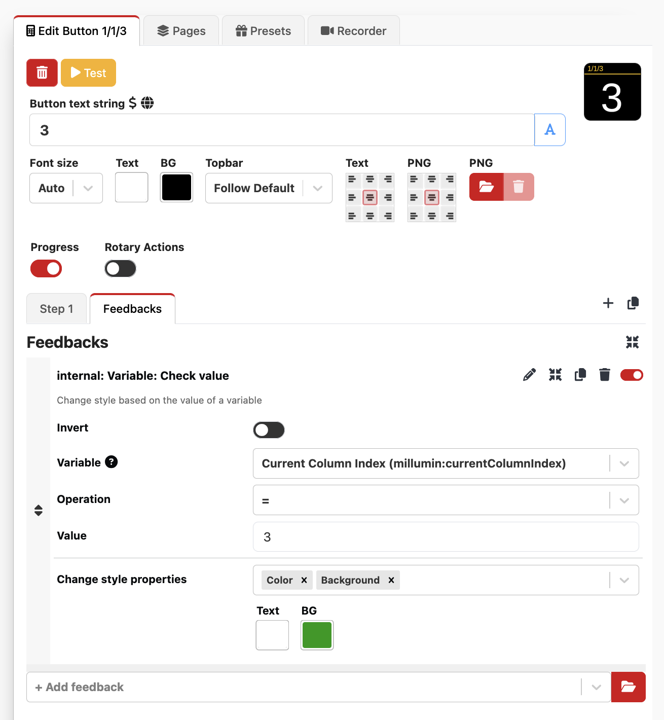 Can anyone pls tell me a way to get the color of a button changed by the actual column status? Classic example would be to have button 1 light up green, when column 1 is running.